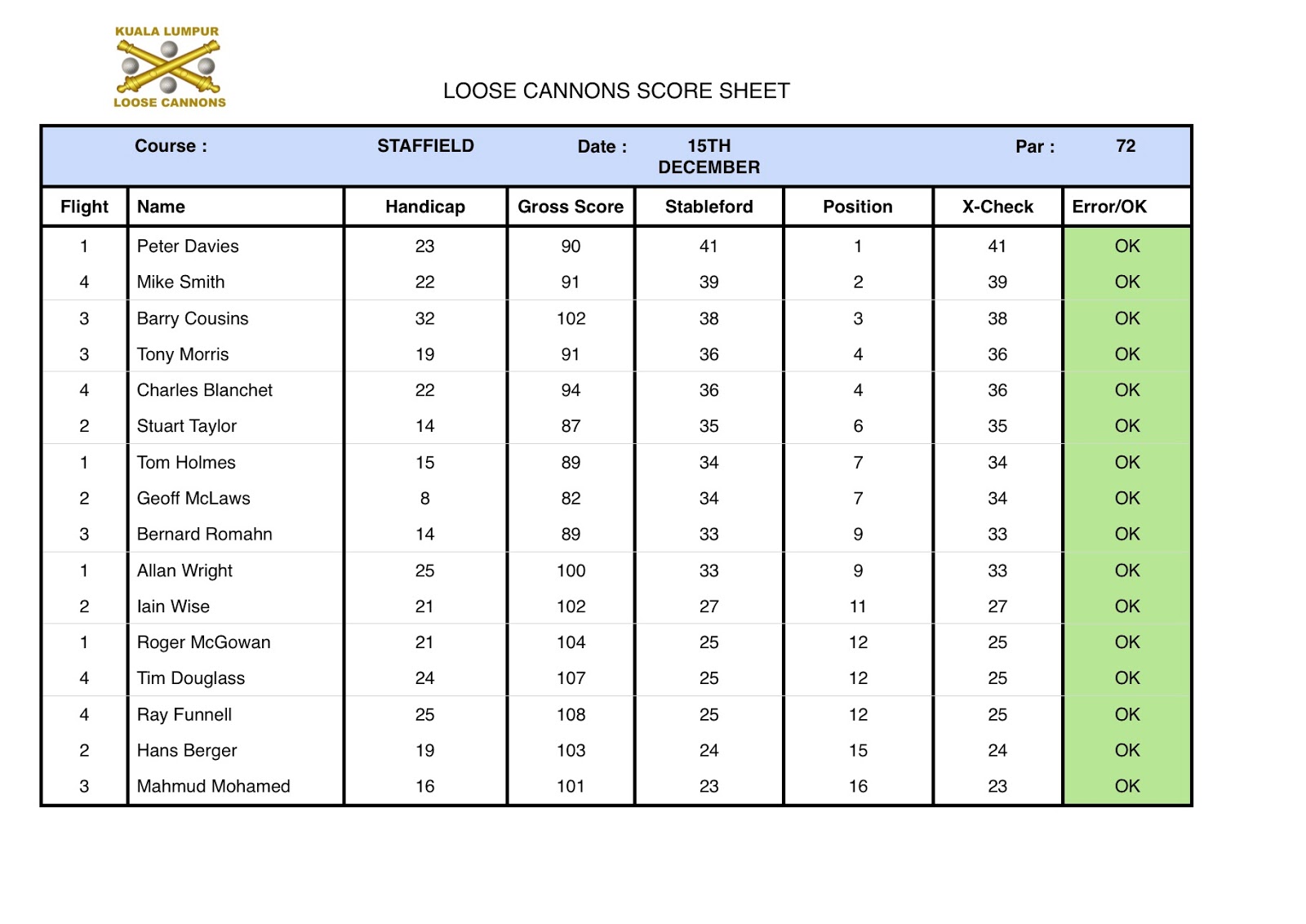 We played Staffield this week mainly to guarantee good playing conditions due to the heavy rain over the lsat week or so which made many courses wet and boggy. Staffield was in great condition even after the very heavy and continuous rain of yesterday. The weather was good with clear blue skies. We had 4 full flights today as we headed out on the North and West courses all finishing in good time by 12:30pm. We then adjourned up the road to our usual East of Highway Restaurant for a good lunch and a few needed cold ones.
