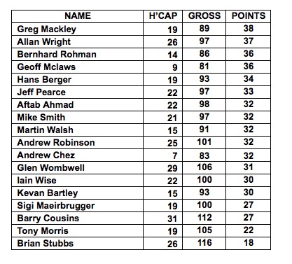 As usual this course can produce some good scores and we had a number of players with more than 36 points. Dave Evans played his best ever round with two birdies and was sitting at lunch after the game thinking he may be in with a good chance to win. However the last group came in with some very good scores ruining Dave’s chance of victory. The winner today was Roger Surieux with a very good 42 points (gross of 95) …. cut 4 …. and runner up on count back was Sigi Maierbrugger with 40 points (gross 87) and an amazing 25 points on his first 9 from Dave Evans and Brian Stubbs both also with 40 points. Best gross if the day was Paul Geddes with an 85. Full results below :