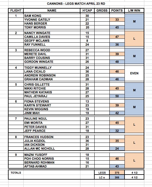 The overall match was a draw with Loose Cannons winning 5 of the matches, LEGS winning 5 matches and two matches were drawn. So 6 points to each side for match No 7.
