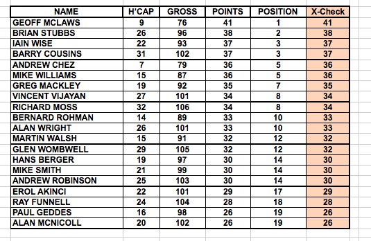 The winner by quite a margin was Geoff McLaws with a consistent 38/38 for the 2 nines with a total gross of 76 and 46 points (cut 10) including a wonderful eagle on the par 5 9th hole on the Northern Nine. Runner up was Kevin Wiggins with a gross 87 for 40 points (cut 1).