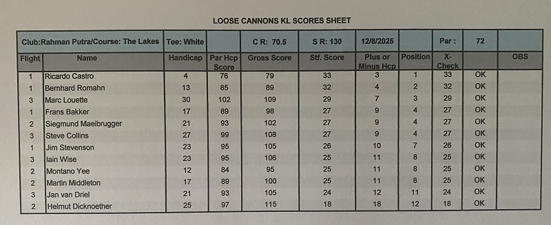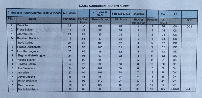 The last game of August, was held at Amverton Cove Golf Club. The weather was hot and dry, with a beautiful blue sky and fantastic course conditions. Today we had three full flights and we all started on hole 1 before 8:00 am, finishing the game before non time. We welcomed Tom Henson for his first game, Dave Evans for his return enjoying golf with us, and Josef Winter for his return from Germany after 5 weeks out for summer holidays. Today’s winner was Marc Louette with a solid 38 points, followed by Ricardo Castro and Jan van Driel booth with 35 points, and in third place was Clive Gordon with a reasonable 34 points. With today’s results, Siggy are the monthly winner with 69 (nice number) points, beating with the highest score of 37 points Reinli Tan and Jan van Driel also booth with 69 points, and Ricardo finished on the podium with 68 points. The games of the month of August are finished, and four more months left to close the 2025 LCPOTY competition, and Ricardo maintains his first position firmly with 118 points, Jan van Driel is second with 66 and Bernhard Romahn is now third with 58 points. See you guys next Tuesday at Staffield.